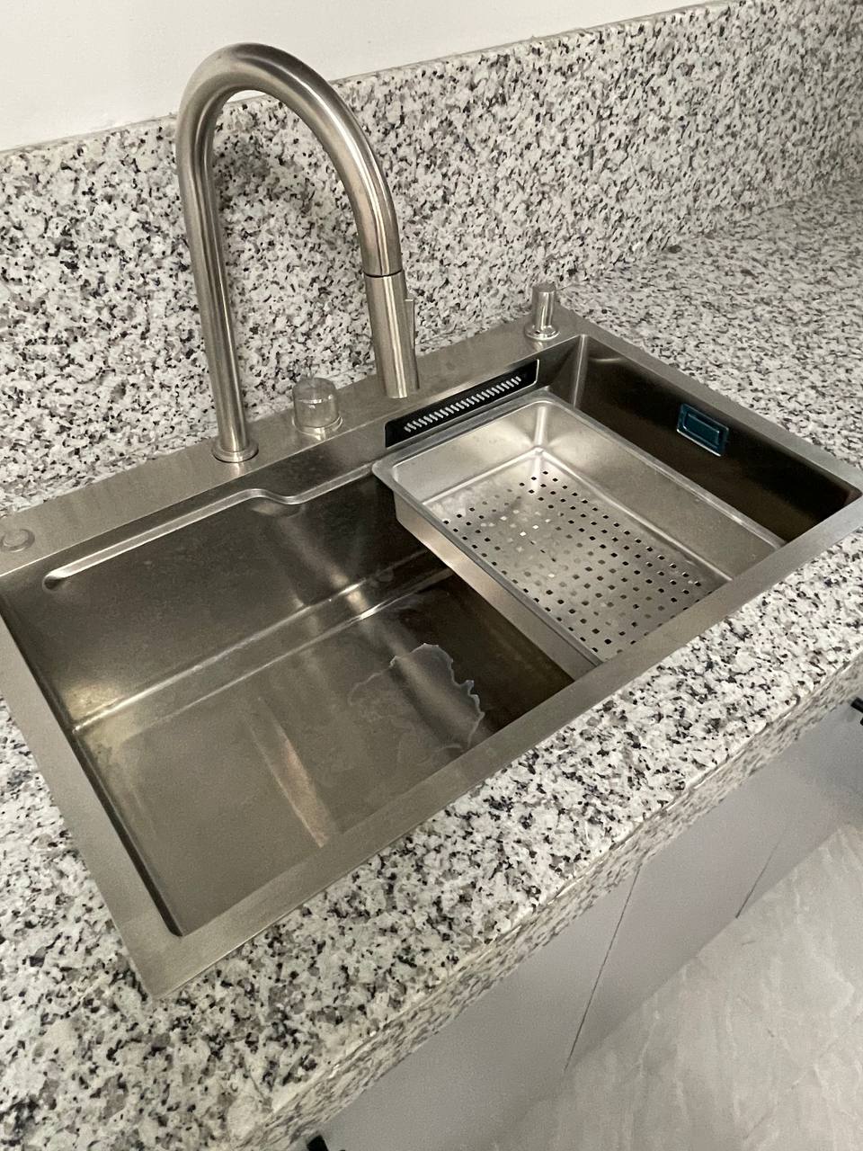 ๐ฐโจ Chef-Grade Stainless Sink This brand-new, deep-basin stainless steel sink is a highlight of the modern kitchen. It features a high-arc gooseneck faucet with a pull-down sprayer and a custom-fitted drying rack, all set into premium salt-and-pepper granite countertops. Like almost everything in this home, itโs sparkling, untouched, and ready for action.