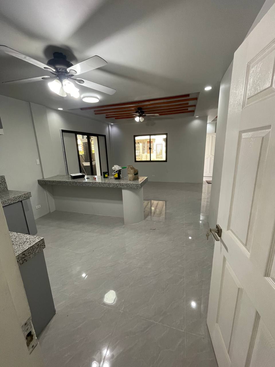 ๐ฝ๏ธโจ Elegant Dining & Seamless Flow The dining area features high-gloss marble-style floor tiles that reflect the warm glow from the designer ceiling fan and recessed lighting. The space transitions smoothly into the kitchen, anchored by a granite breakfast bar, while a sleek black-framed sliding door opens directly to the private outdoor area.