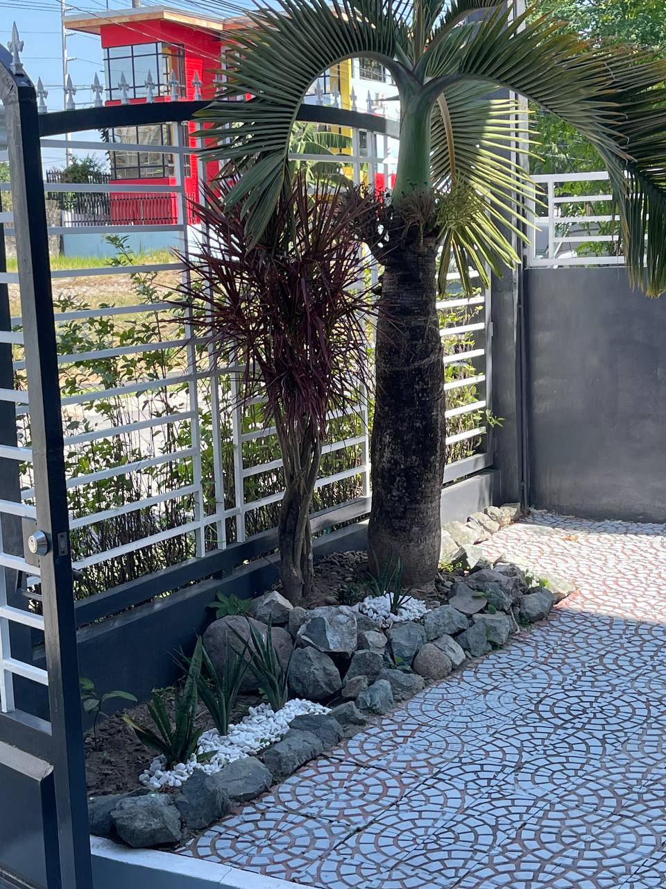 ๐ฟ๐ช Welcoming Greenery A palm tree stands guard near the open front gate, framed by a mix of natural grey stones and desert-style plants.