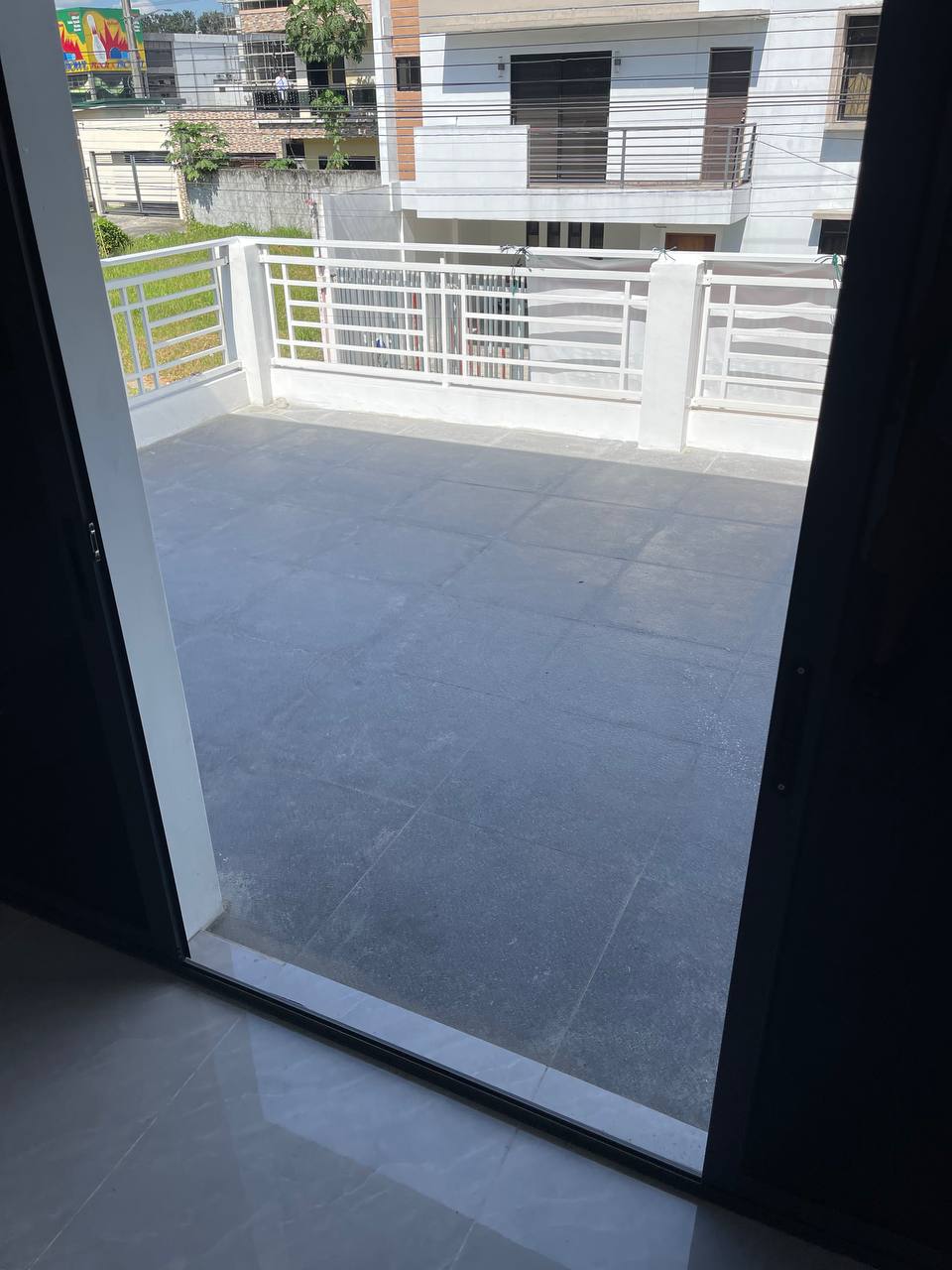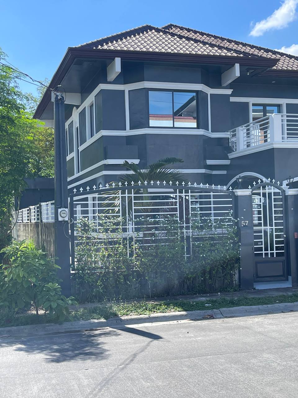 ๐ ๐ Premium Curb Appeal The deep grey walls contrast beautifully with the bright white accents and massive, crystal-clear windows. A private balcony with matching white railings sits beside the main window suite, overlooking the street and lush greenery that lines the front of the property.
