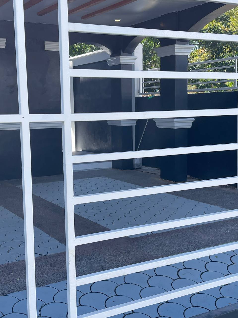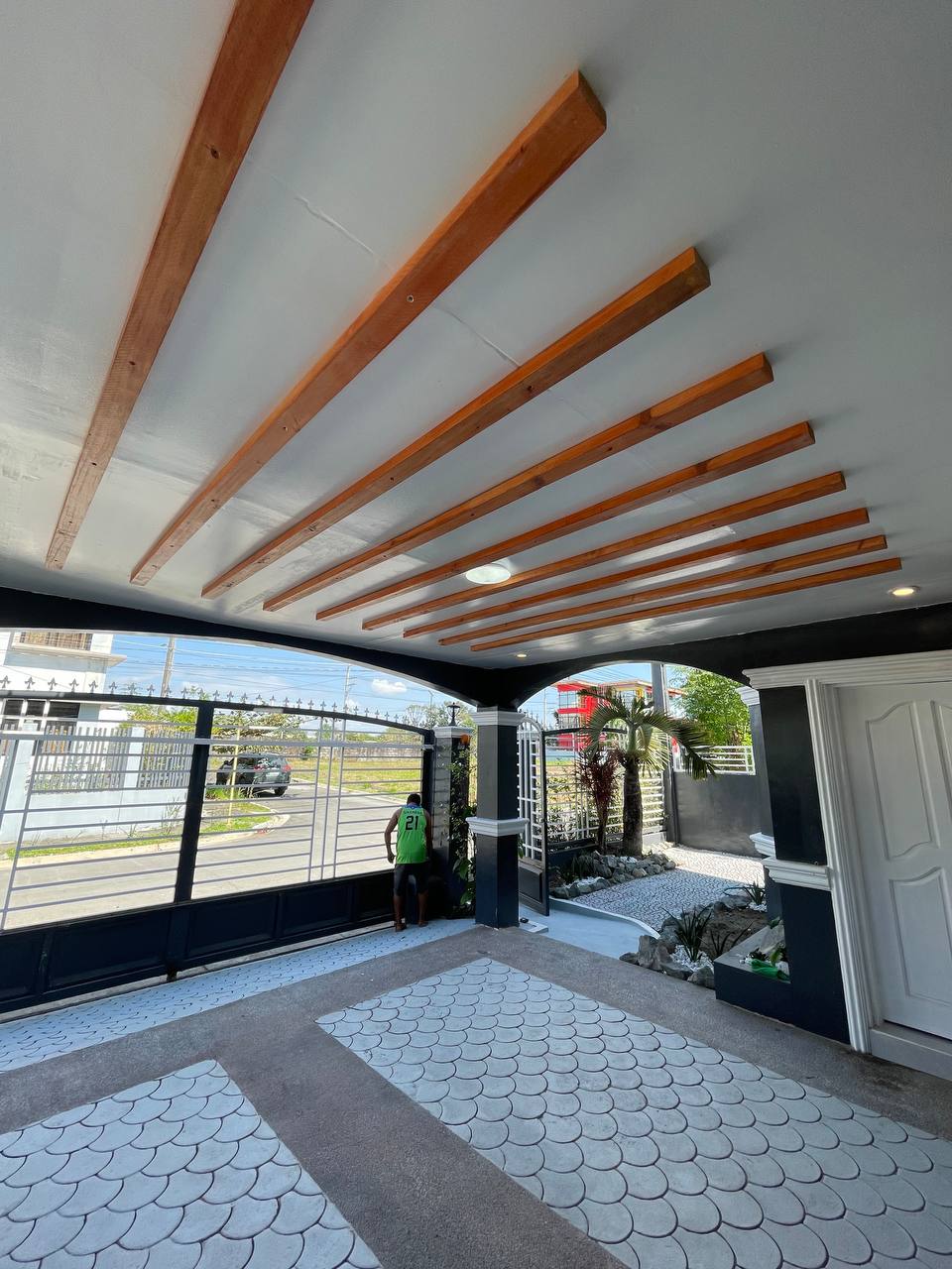 ๐ช๐ก Carport View Closed sliding gate in front, columns supporting the covered area behind. Ceiling with beams and recessed lights overhead. Floor patterned with tiled designs, bordered neatly. A straightforward, orderly view framed from the street.