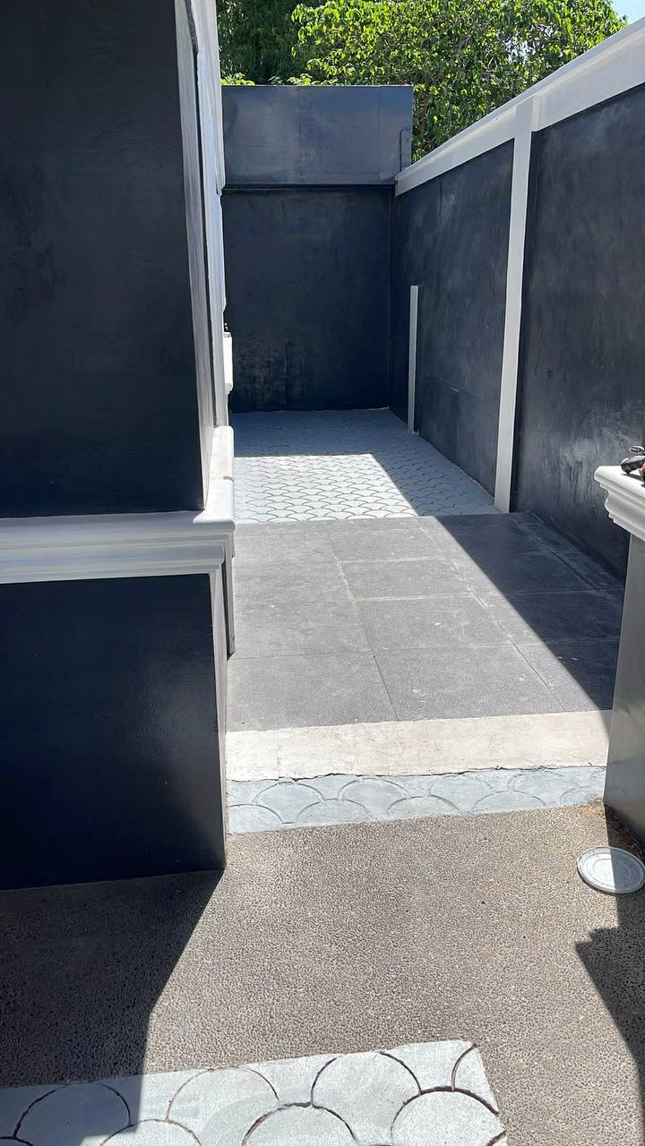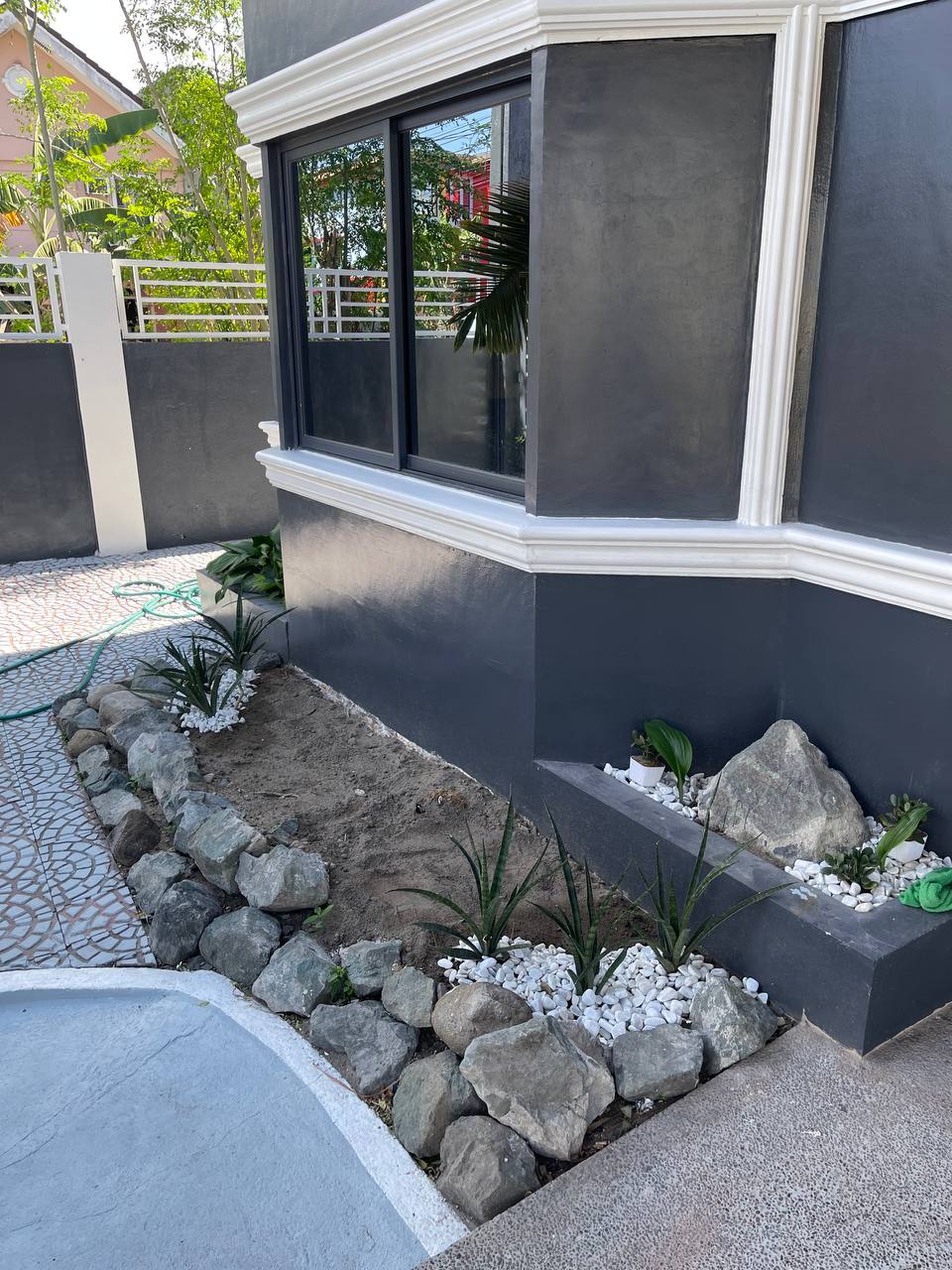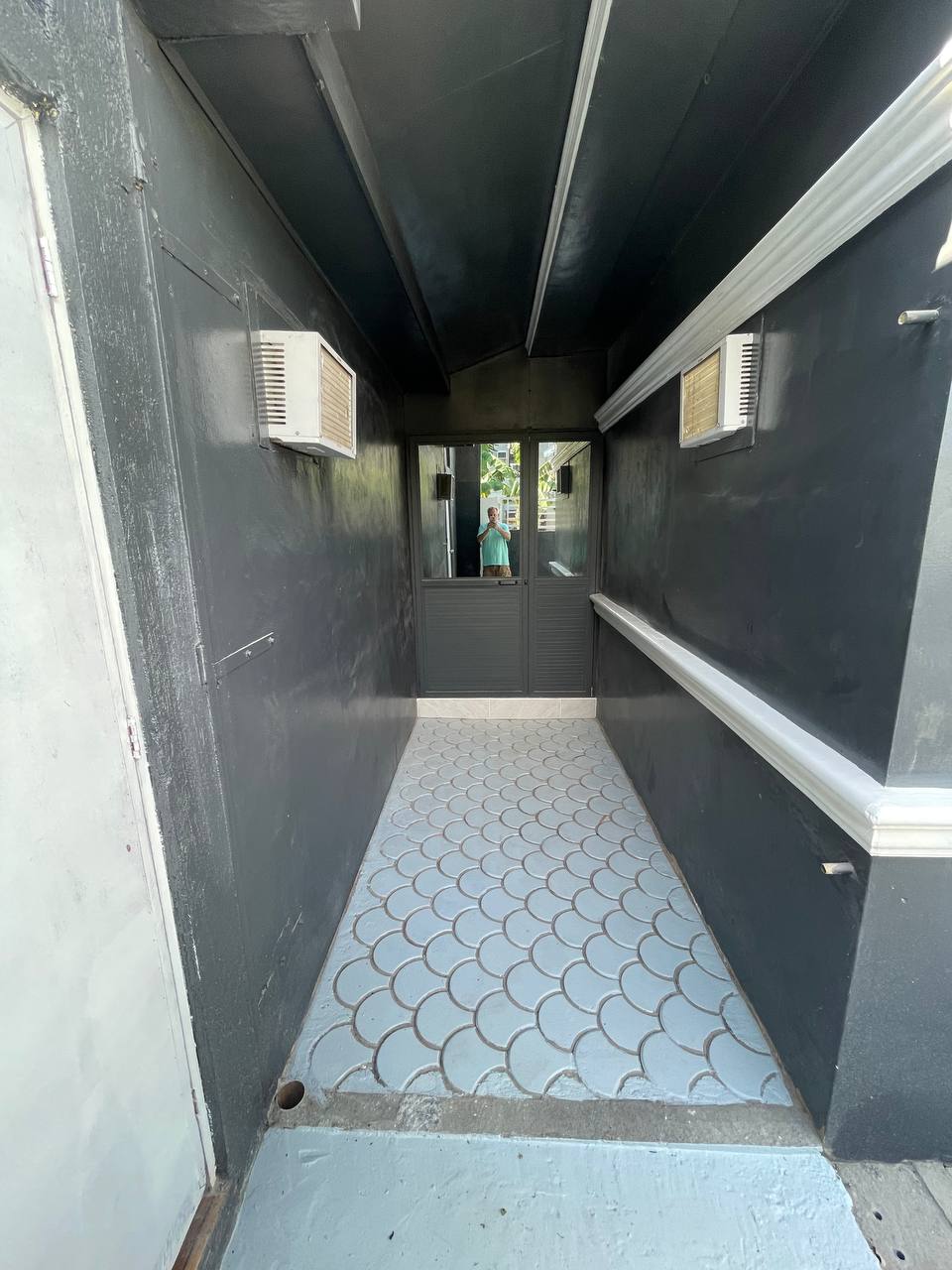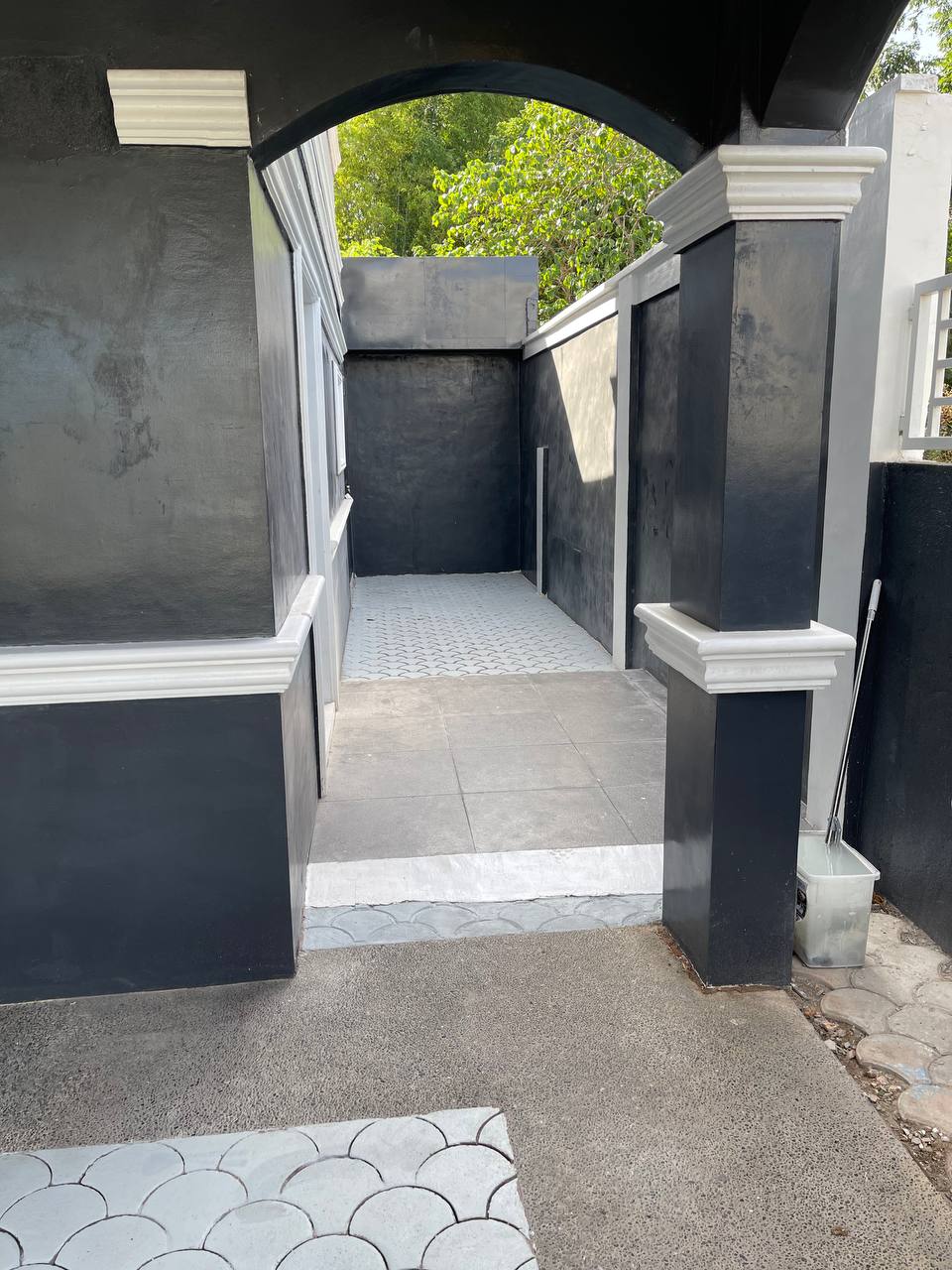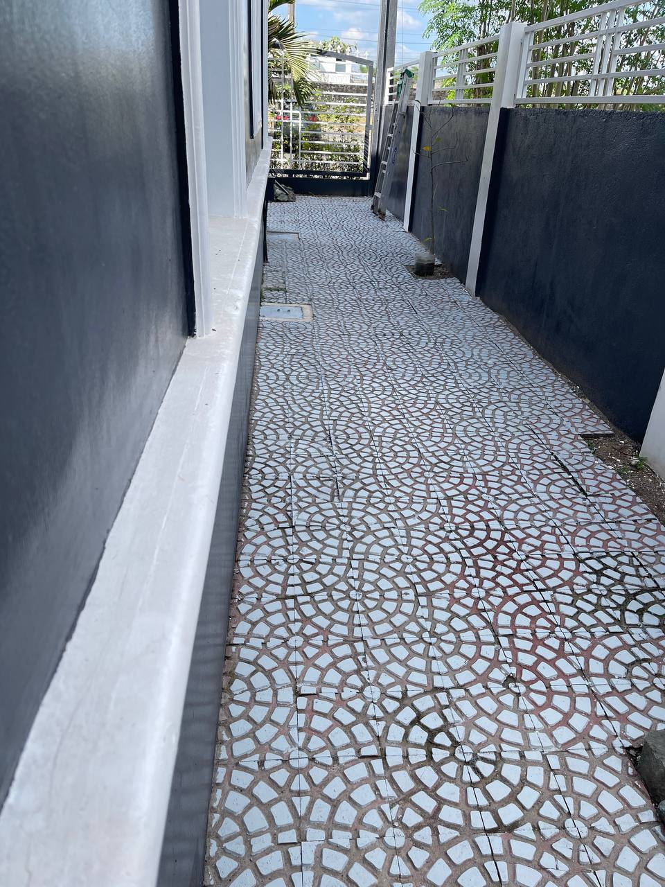 ๐ค๏ธโจ Tiled Side Walkway This shot highlights the clean lines of the home's right side, featuring a long path of intricate, fan-patterned circular tiles. The deep charcoal walls and crisp white baseboards create a sharp contrast that runs the length of the property.