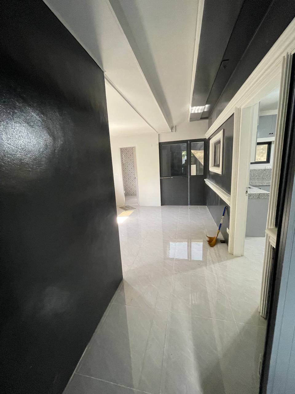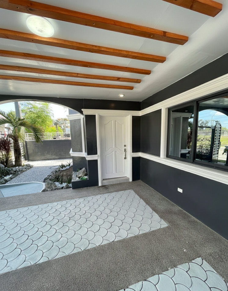 ๐ช๐ Front Door & Entryway Elegance The primary entrance features a crisp white door set against deep charcoal walls, beautifully accented by bold white architectural moldings. This space acts as a seamless extension of the carport, highlighted by a designer ceiling with exposed wooden beams and warm recessed lighting.