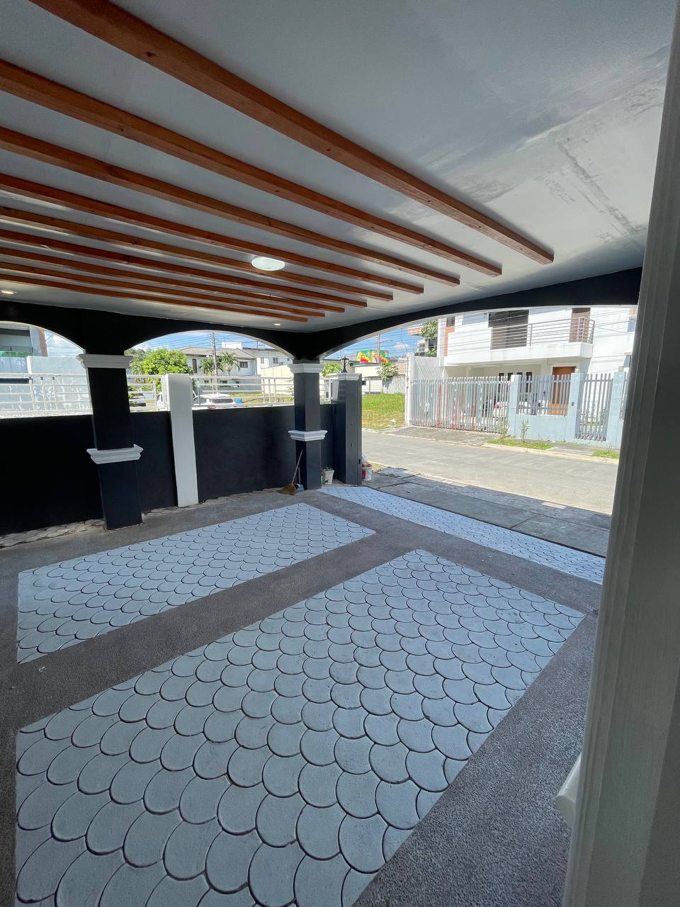 ๐๐ชต Spacious Carport with Designer Ceiling This wide-angle view reveals a massive carport area highlighted by exposed wooden ceiling beams and recessed lighting. The space is framed by dark grey columns with crisp white moldings, while the unique fish-scale patterned tiles add a high-end texture to the entire driveway.